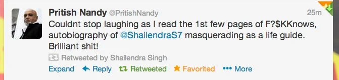 “Couldn’t stop laughing as I read the 1st few pages of F?@K Knows, autobiography of @ShailendraS7 masquerading as a life guide. Brilliant shit!” Tweet from Pritish Nandy.