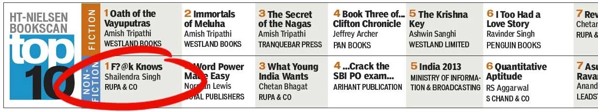F?@k Knows reaches #1 on the HT-Nielsen Non-Fiction Top 10 list, just 45 days after release. Hindustan Times, 2013.